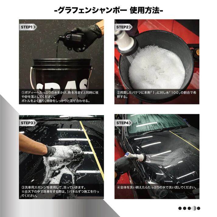 グラフェン配合のため液剤色は黒く、初めての方は驚かれるかもしれませんが、問題ございません。当店でも洗車業務に使用しており、気持ちの良い疎水効果を実感しております。
